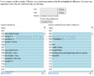 Le utility di comparazione files sono utili quando effettuiamo il coding, programmiamo oppure vogliamo rilasciare una nuova versione di un css.. Le finalità di queste applications sono pressochè infinite. Il problema è che le utility di comparazione files sono molte volte a pagamento, in tal caso vi suggeriamo di visitare l’articolo “DiffMerge, diff e merging tra due files” che tratta Diffmerge, ottimo sw freeware per la comparazione files, analizzare differenze ma anche fare il merging (inserire dati assenti da un file ma presenti nell’altro file oggetto di comparazione). Chi per caso si trovasse con un Netbook e non fosse interessato all’installazione di ulteriore sw visto lo poco spazio a disposizione potrebbe prendere in considerazione una nuova Web Application disponibile collegandovi su comparemyfiles.com.
