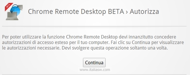 Per utilizzare Chrome Remote Desktop dobbiamo concedere le autorizzazioni di accesso esteso a entrambi i computer. Premiamo il pulsante continua.