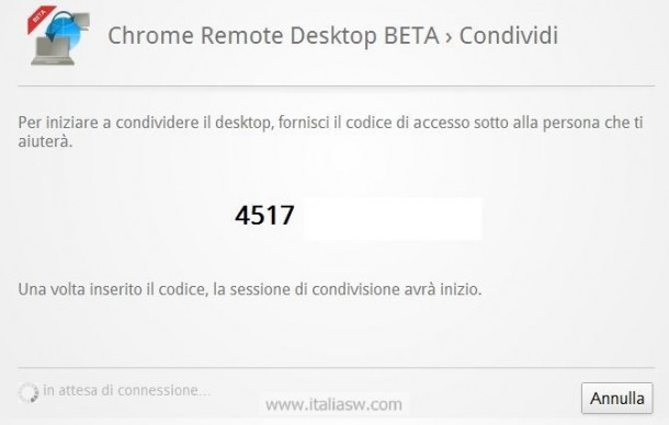 Il plugin genera un codice di 12 cifre che deve essere inserito nella macchina remota per dare inizio alla connessione. Tuttavia, se l’utente interrompe la connessione in qualsiasi momento, un nuovo codice deve essere generato per consentire nuovamente l’accesso.