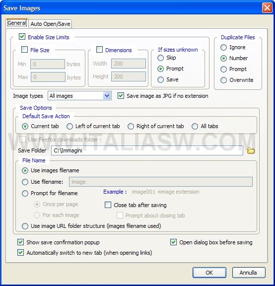 - Conclusa l’installazione dell’estensione clicchiamo sopra Strumenti, Save Images – Options e apparirà la stessa finestra che vedete in basso. Ora dobbiamo specificare dove andare a salvare le immagini (Save Folder) e scegliere eventualmente cosa fare per i duplicati (Duplicate Files).