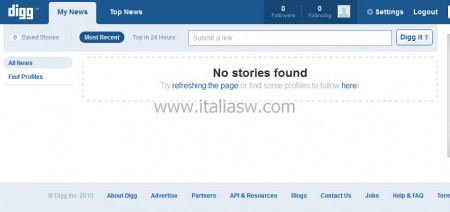 La procedura di login funziona ? Abbiamo provato il login con Twitter e non funzionava correttamente, inserito l’indirizzo email compariva il messaggio “You must be logged in to access this page.” Il problema era momentaneo, un refresh della pagina consentiva di visualizzare, finalmente, la nostra “Bacheca” e le varie opzioni utente. Il problema si è ripresentato dopo qualche minuto lasciando presupporre che i problemi nascessero dall’enorme flusso di persone che stanno visitando e utilizzano in queste ore il nuovo Digg.