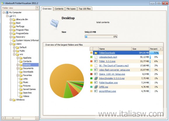 Quanto spazio viene occupato da Windows ? Quanto spazio viene occupato dai programmi che sono stati scaricati con eMule ? Windows vi ‘tormenta l’anima’ visualizzando un messaggio informativo sulla scarsità di spazio a disposizione ? Dovete prendere dei provvedimenti. Pulizia Disco è l’utility ‘che corre in vostro soccorso’. Si trova in Start > Tutti i programmi > Accessori > Utilità di sistema e serve a cancellare i file inutili, i file temporanei e a recuperare un pò di spazio dell’hard disk. Ora che avete recuperato un pò di spazio provate ad installare e ad eseguire FolderVisualizer. Il software supporta XP, Vista e Windows 7. Analizza il contenuto dell’hard disk offrendo un report di ogni cartella. Capirete, immediatamente, dove potete agire eliminando uno o più file di cui vi siete dimenticati.