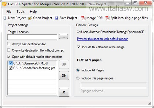 Un tool da non farci mancare alla nostra suite personale per la produttività (Adobe Reader + PDF Printer + PDF Converter) è sicuramente Gios PDF Splitter and Merger, sw portable che serve al splitting e merging di files PDF. Cosa significa ? Con Gios PDF Splitter and Merger l’utente potrà creare un nuovo PDF che comprenda immagini ed il contenuto di altri PDF. Si tratta di una soluzione interessante, per chi debba aggiungere ad un file PDF un FAX o qualsiasi altro documento, senza per questo rivolgersi ad un sw a pagamento, ciò perchè si tratta di una licenza LGPL.