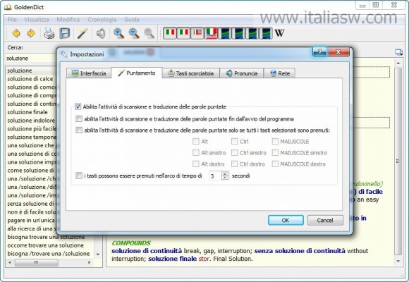 GoldenDict è “cross-plattform”, significa che potete utilizzarlo su Linux e Windows e supporta un sacco di formati di dizionario, è in grado di interpretare correttamente i dizionari StarDict (formato Dict), quelli di Babylon (formato BGL) e i file ABBYY. Di più, è possibile utilizzare Wikipedia e Wikizionario e analizzare e visualizzare dati da altri siti Web, quindi è possibile utilizzare GoldenDict per cercare parole e riferimenti (finché il sito in uso supporta query basate su URL). GoldenDict offre anche una comoda funzione per effettuare una scansione automatica del testo e visualizzare un popup quando selezioniamo una parola, un sistema efficace simile a quanto offerto da Babylon. Oltre alla funzionalità di base, GoldenDict supporta inoltre nativamente Unicode, i segni diacritici, i segni di punteggiatura e offre la possibilità di pronunciare le parola, funzione utile se avete bisogno di sapere la pronuncia esatta.