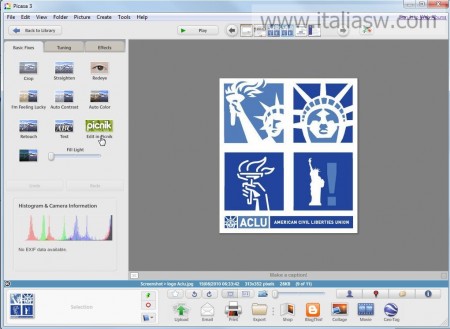 Per procedere all’editing delle foto su Picnik l’utente deve premere il pulsante Picnik dopodichè, problemi di connessioni di rete a parte, potrà procedere alla modifica foto online.