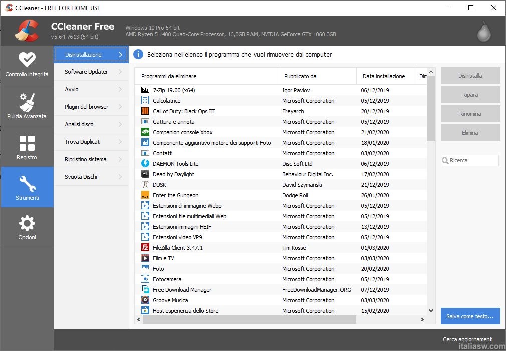 Software indispensabile PC per la rimozione programmi inutili, applicazioni Modern UI, ottimizzare il registro di Windows e disattivare e/o rimuovere programmi dall'avvio automatico. CCleaner è disponibile per Windows a 32 e 64 bit.