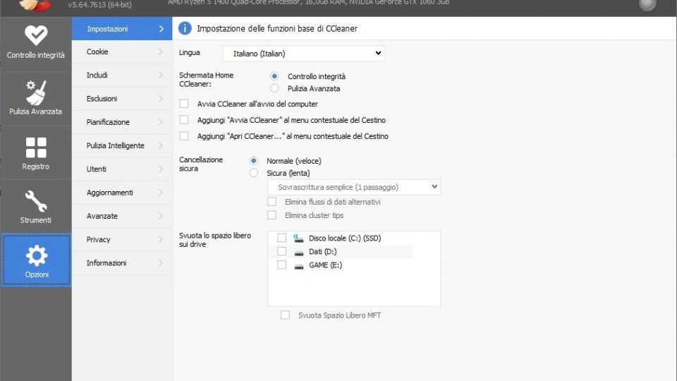 Nella sezione Opzioni potete attivare la cancellazione sicura dei file, integrare CCleaner al menu contestuale del Cestino di Windows (consigliabile se pianificate di utilizzarlo spesso) oppure pianificare l’esecuzione automatica di CCleaner a intervalli regolari (consigliato quando avrete maggior dimestichezza con il programma).