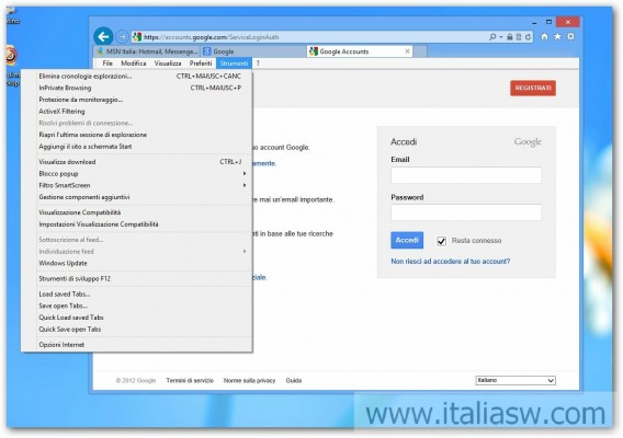 Il ripristino della sessione di navigazione è altrettanto semplice e consiste nell’abilitare il menu di Internet Explorer (pulsante Alt), posizionarci in Strumenti, Load Saved Tabs e caricare il file che ci interessa.
