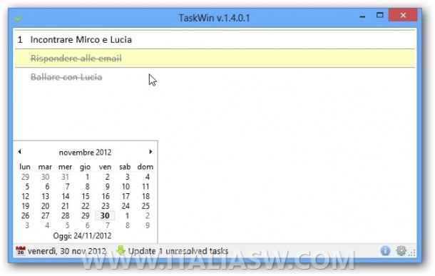 TaskWin non integra funzioni di sincronizzazione. Non offre sistemi di etichettatura “Intelligente” e non troviamo alcun indizio evidente di come debba essere utilizzato nella sua interfaccia utente. Cattivo Design oppure il futuro delle interfacce utente? La risposta esatta è la numero due. TaskWin è troppo semplice per non capire come debba essere usato efficacemente. Cliccate con il mouse sopra l’icona del calendario, scegliete la data in cui dovete completare uno o più scadenze oppure avete degli appuntamenti, fate un doppio clic in mezzo alla finestra di TaskWin e stendete la vostra lista.