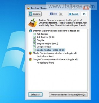 Toolbar Cleaner è un software per rimuovere dai Browser toolbar e componenti aggiuntivi non richiesti. Elimina i “componenti iniettati all’interno del browser” lasciando all’utente l’eventuale compito di disinstallare i singoli software dal Pannello di Controllo che sono stati resi, nel frattempo, innocui.