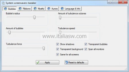 La soluzione al nostro problema è un software chiamato System ScreenSavers tweaker attraverso cui è possibile regolare gli effetti dei singoli screensaver. Provate a cliccare sopra Bubbles per regolare fra le tante cose il numero di bolle, la forza delle turbulenze, abilitare i riflessi oppure abilitare uno sfondo trasparente.